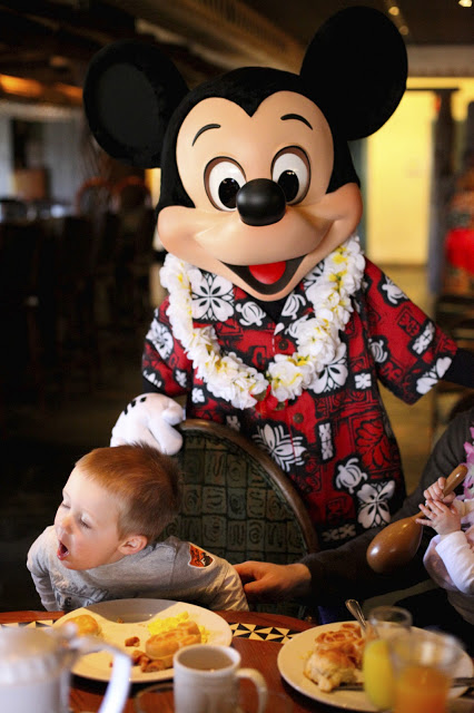 We watched all the characters walk around to each table we waited patiently for our turn. Then finally it had arrived. The moment we had been waiting for for months. Peyton was about to meet Mickey Mouse face-to-face for the very first time. I got myself in position, focused my camera and waited for his reaction. Little did I know the reaction I had hope for of happiness and joy turned out to him be having a full on coughing fit. Right there in front of Mickey Mouse Peyton was hacking away. It wasn’t even a real cough either. It was a fake cough. I stood there mortified and could not believe it. So instead, I kinda laughed, encouraged him to stop, and snapped away. It actually was pretty funny.