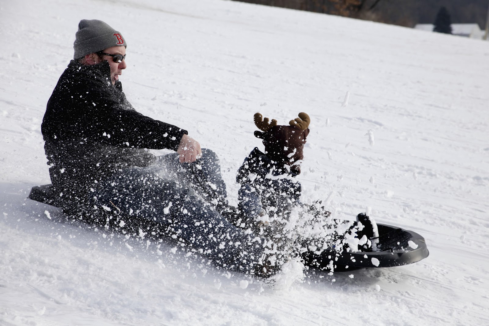 So as part of the Christmas re-do my father (see right with his Clark Griswold sled!) had the brilliant idea to go to our favorite childhood sledding hill. Of course, we all rolled our eyes and thought ‘yeah, okay dad…’ As it turns out we had SUCH a great time. I only got to go down once because like the photographer I am I was having way too much fun shooting! Seeing everyone’s expressions were priceless! I finally feel like I got to ‘unleash the beast’ in my 5D Mark II and see just how many pixels it has. The snow flying through the air on the shots was amazing! It looks like 3D CG Animation! I was so impressed and this fun shoot that has nothing more than personal value to me solidified my upgrade to this camera. On top of that we got to see some kid wipe out going mock 1 down the hill and in true Christmas Vacation style only stopped when a tree broke his speed and hit him right between the legs! I was about 5′ away and that kid couldn’t get up. He almost ran over my nephew on the way down too! Hopefully he’ll pull the brakes next time!