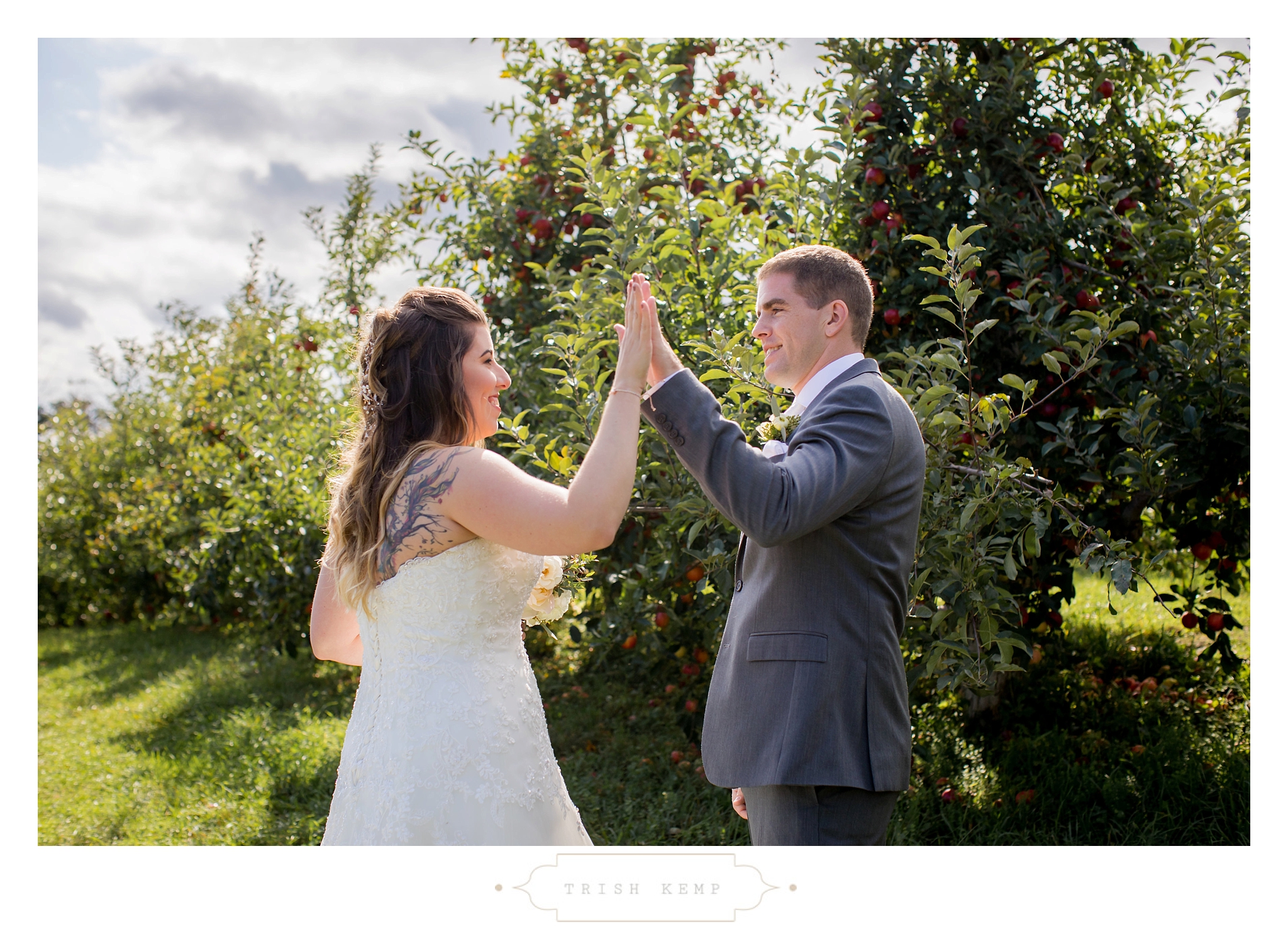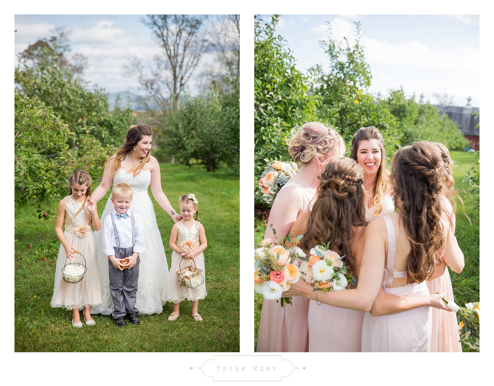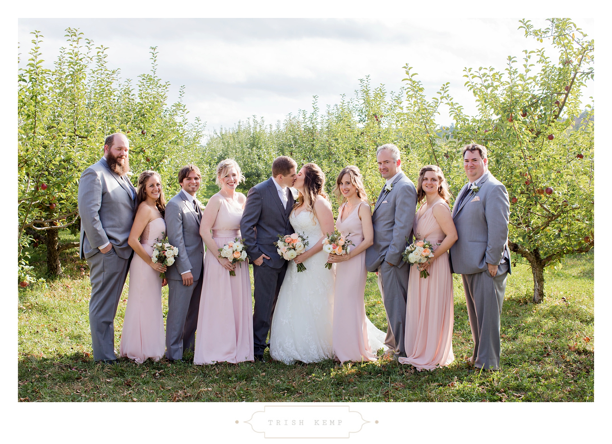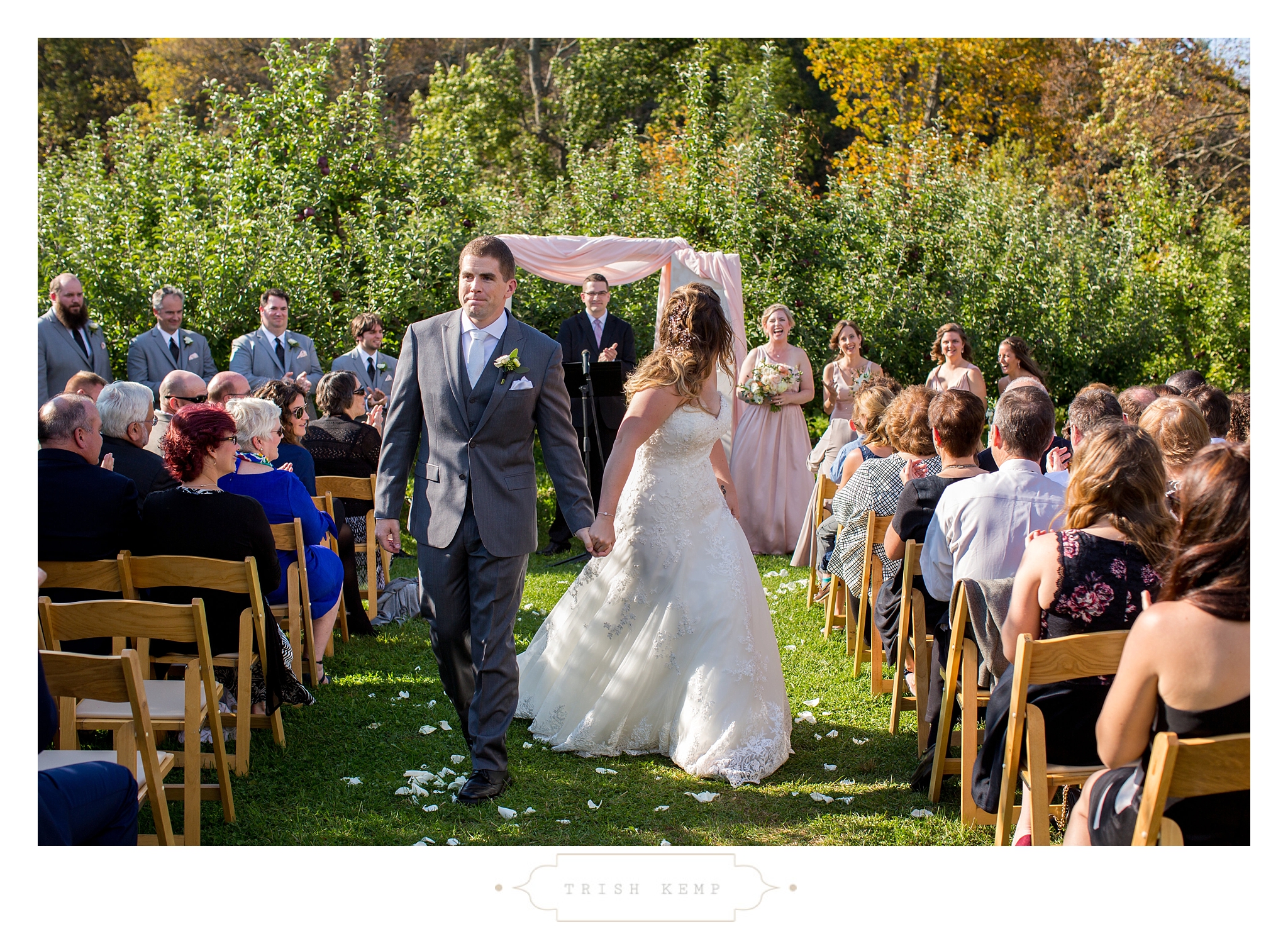 Their ceremony was held in the orchard under the fruitful apple trees. a light breeze which moved the bridesmaids dresses gently in the wind, provided the perfect touch of whimsical to this lighthearted ceremony. When the ceremony ended, these guys greeted their bridal party as they came back down the isle with ‘good game’ style high fives, that made for great photos of everyone celebrating the newlyweds.