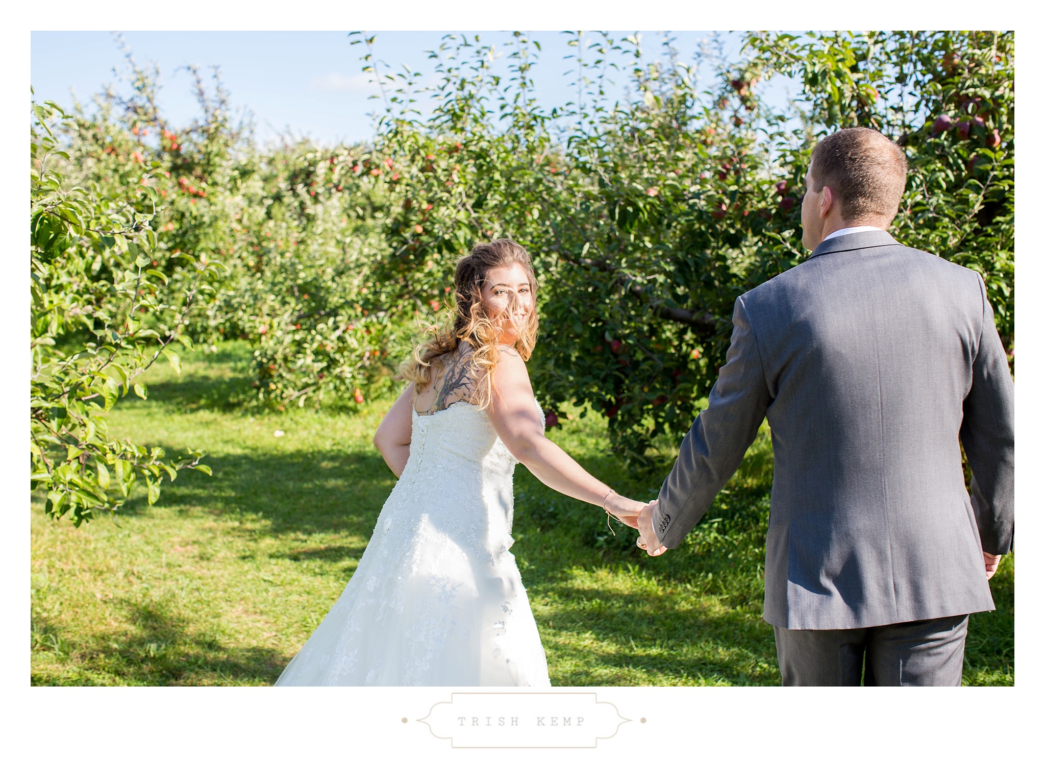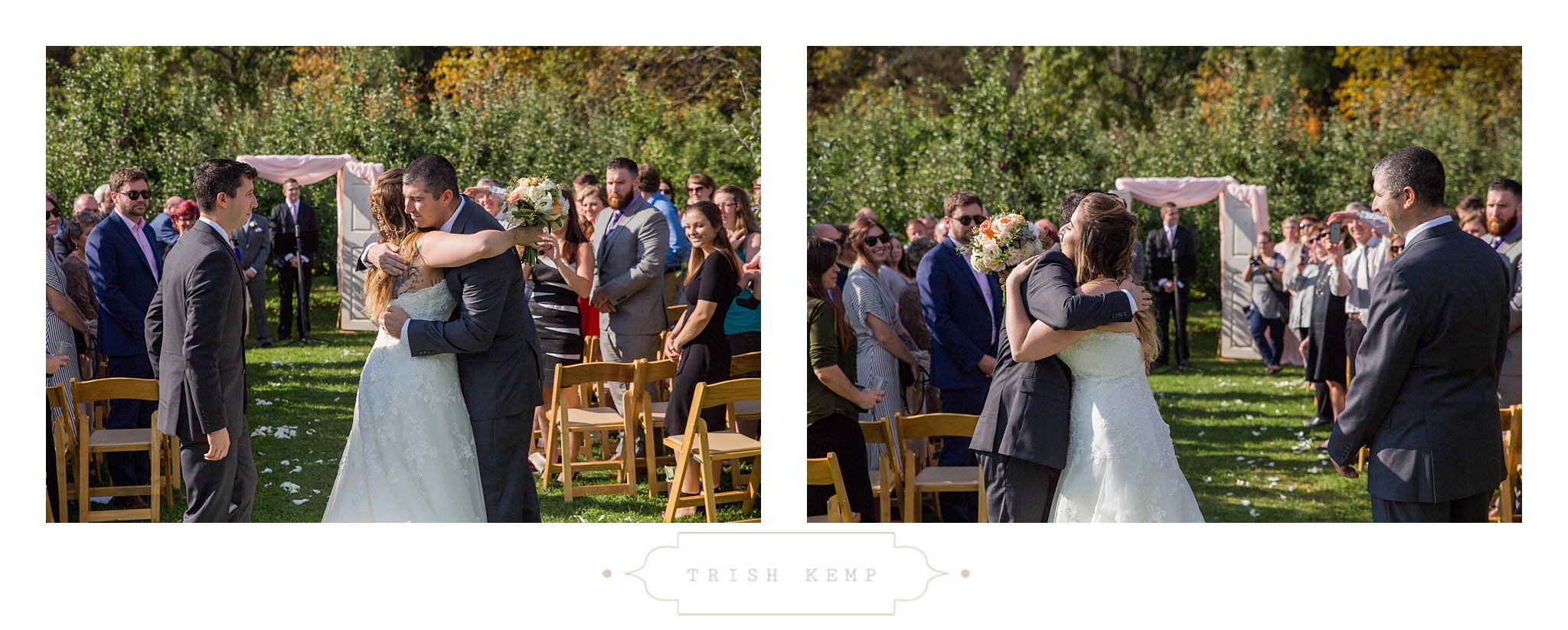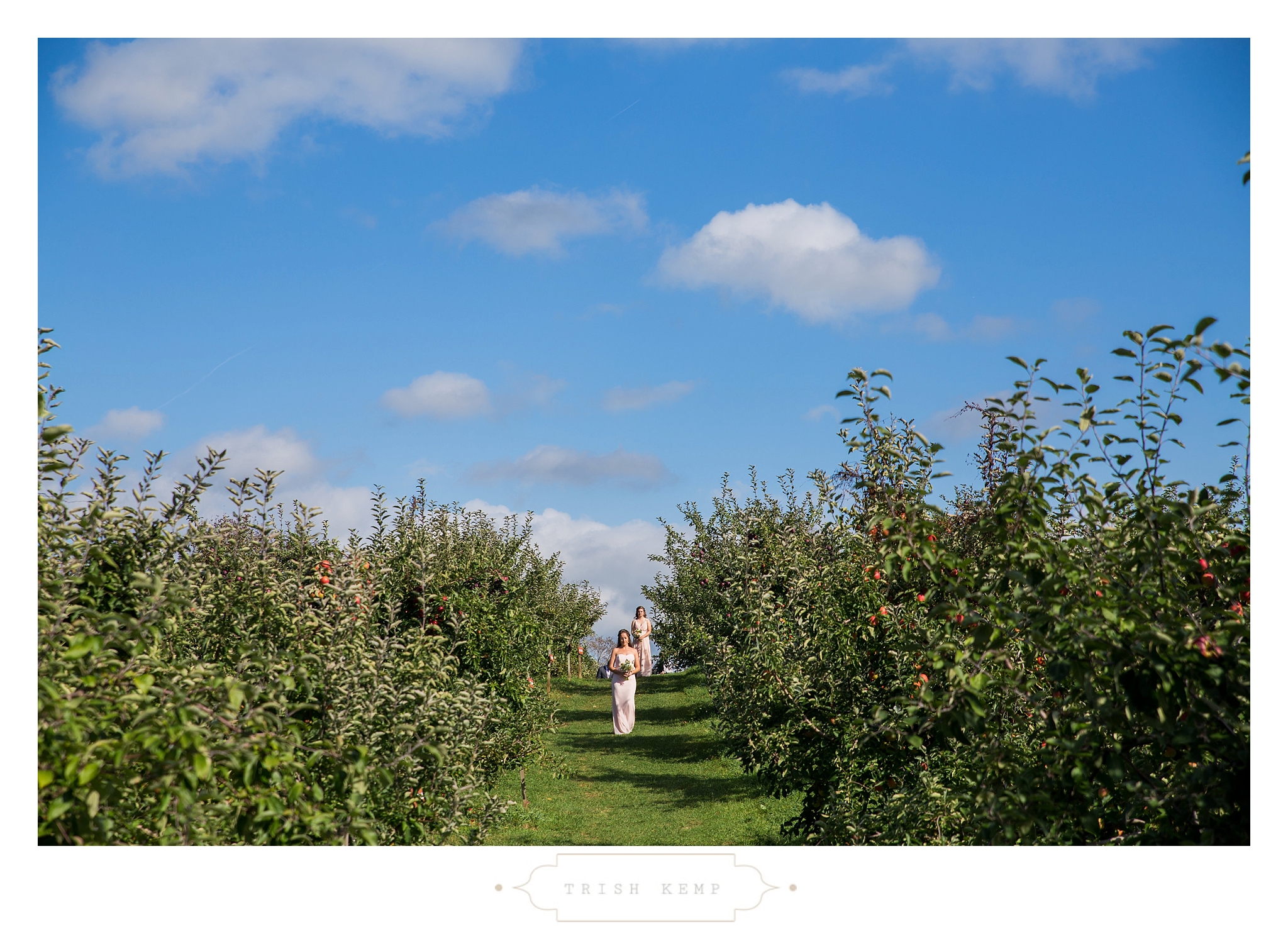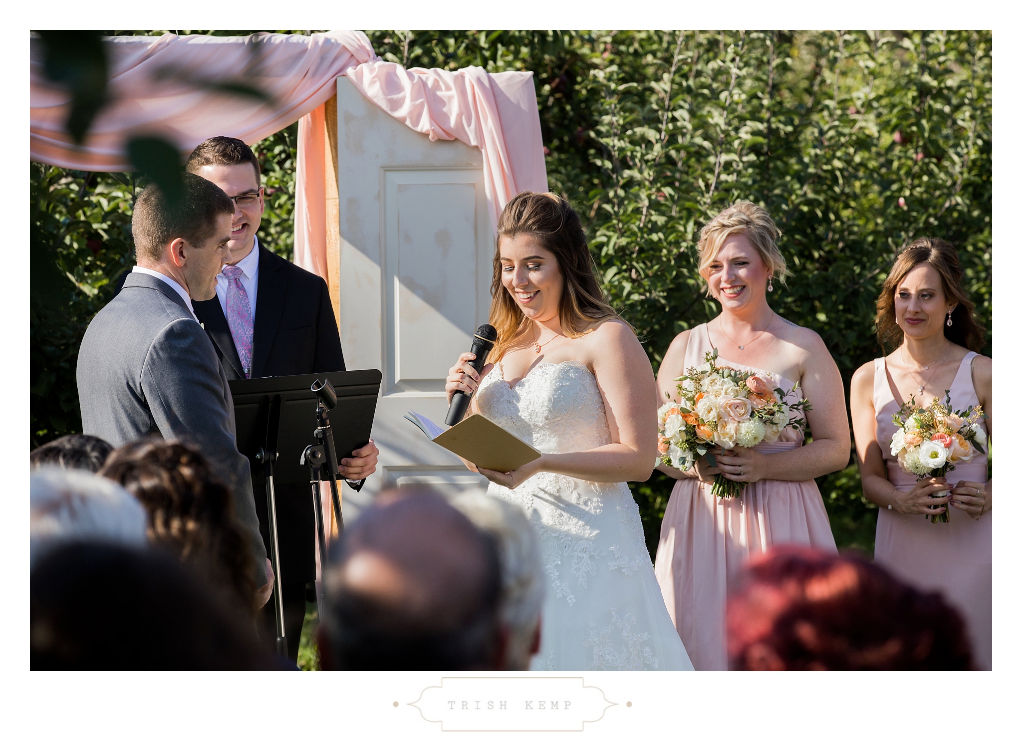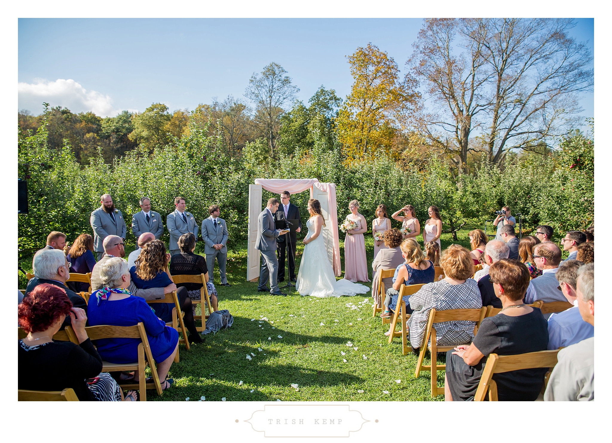 Their ceremony was held in the orchard under the fruitful apple trees. a light breeze which moved the bridesmaids dresses gently in the wind, provided the perfect touch of whimsical to this lighthearted ceremony. When the ceremony ended, these guys greeted their bridal party as they came back down the isle with ‘good game’ style high fives, that made for great photos of everyone celebrating the newlyweds.